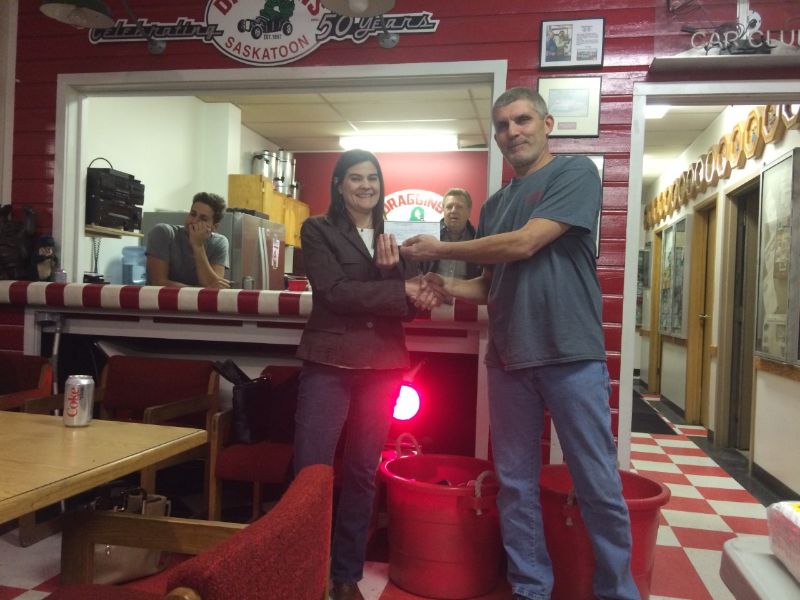 Nov 6 2017 the club members gathered to make another donation to support Camp Easter Seal. Current club president Bob Gawdun presented $35,000 on behalf of the Draggins Rod & Custom Car Club to Martie Hayden of SaskAbilities. She expressed their appreciation to the club & had some interesting comments that she delivered from special young people attending camp last summer.
